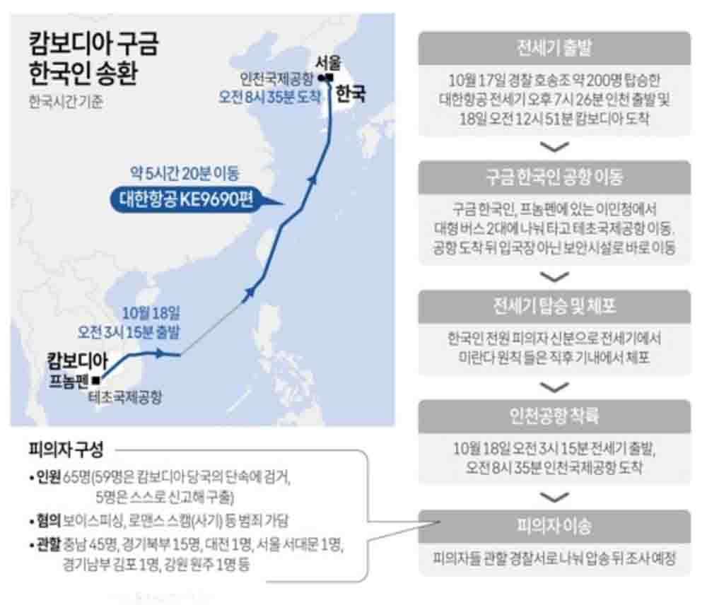 ┃'캄보디아 구금' 64명 프놈펜 출발 / 전세기 타자마자 체포 / '전세기 투입' 집단 송환 3번째 / 경찰 호송조 190여명도 동승 / 캄보디아 한국인 구금자들 송환 / 18일 오전 한국 도착 예정